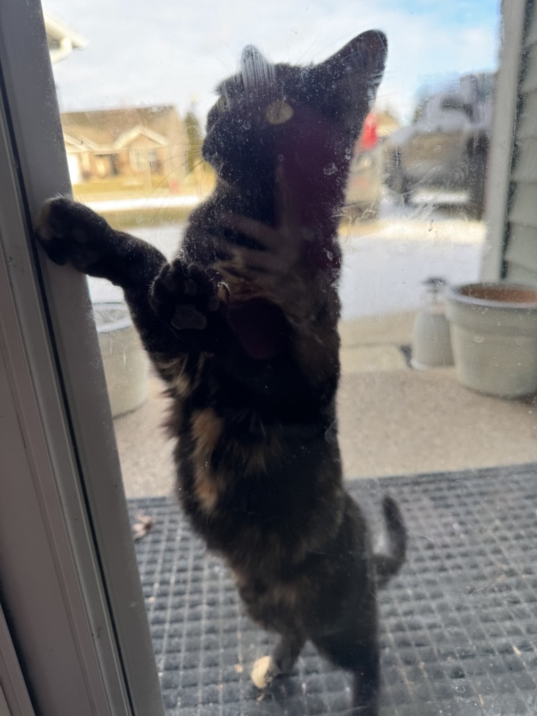 Found a friendly black and tan Tortoiseshell cat that has been visiting our house for the past 3 days. She is very vocal and wants to come inside. Appears to declawed.