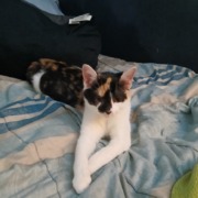 Miss Honey is a smaller calico. She has black down her nose and is very tame and sweet.