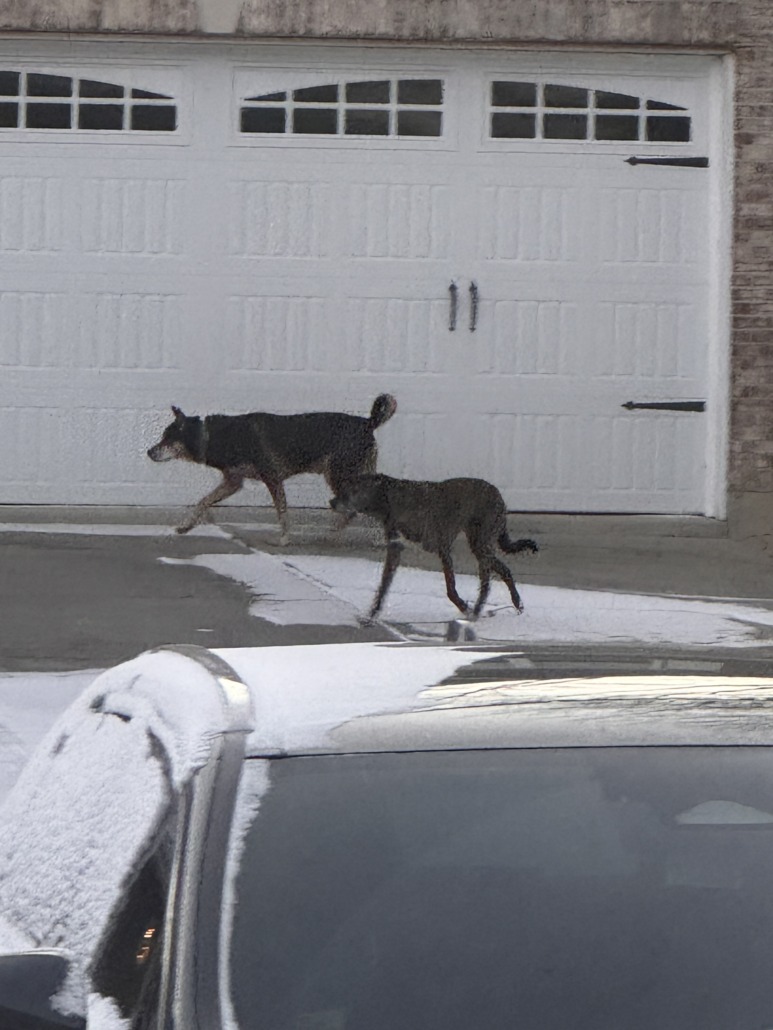 Two large breed dogs running loose together in Briarwood Trace subdivision in New Palestine. This sighting is for the shepherd/husky mix. Wearing collar. It’s hard to tell the breed. Headed east together. Could not get close.