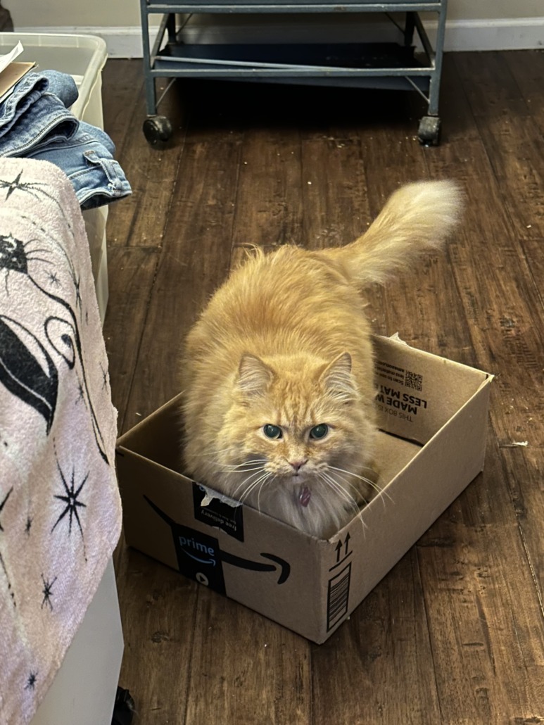 She is 17, no health problems, friendly, orange fluffy fur, purple collar with pink heart id tag