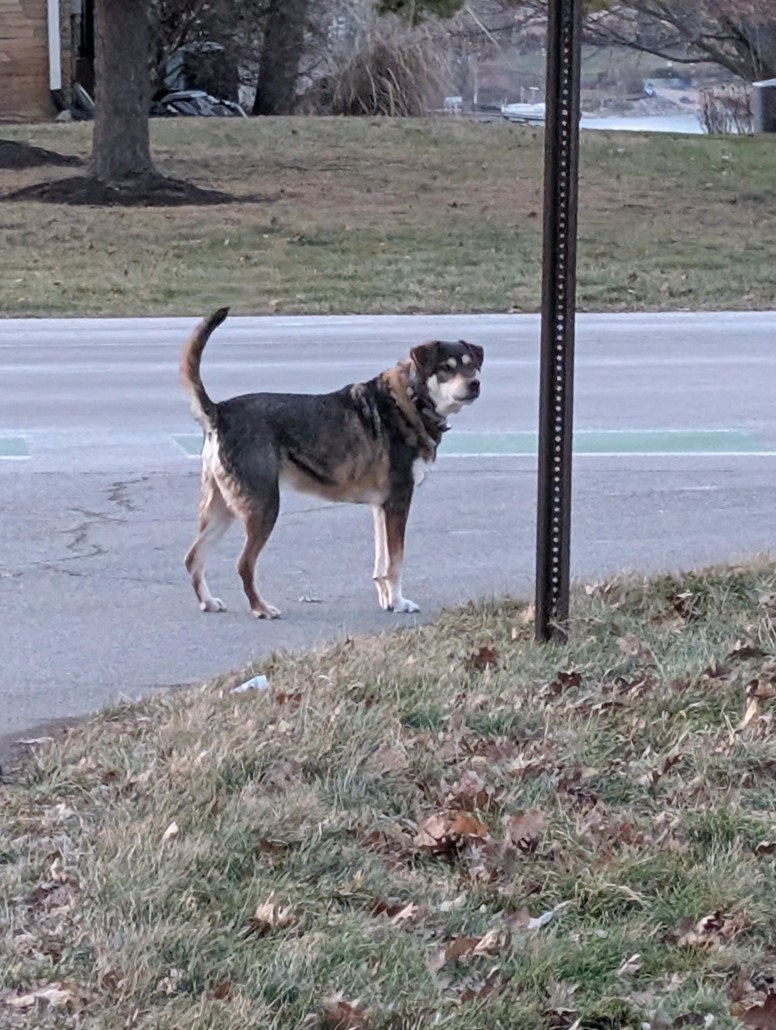 Possibly senior dog, brownish coat and white face, has collar. Has been in the area for multiple days.