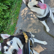 Stella is a husky. She is the dog on the right side of this picture. Her coat is white and gray. She is friendly.