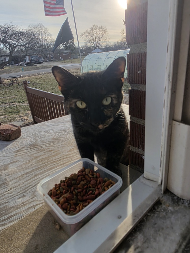Tortie female has been hanging around my house for about a week. She is super sweet and has tried to enter many times. She doesn’t leave my property and I am very concerned for her with the impending winter storm. I already have cats and can not take any more in.
