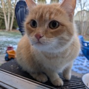 Orange and white cat. Distinct white tip of tail. Collar with no identification. Proof of ownership is required
