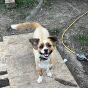 Name is Elias. Chihuahua mix. Approximately 17lbs. White, light brown and black. Has a snag tooth. Freshly groomed. Under, paws and some of his face is white. White strip down from forehead to his snout. Tip of tail is white. No collar. Brown eyes.