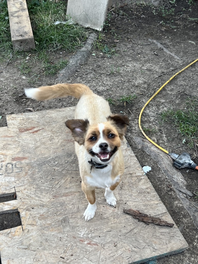 Name is Elias. Chihuahua mix. Approximately 17lbs. White, light brown and black. Has a snag tooth. Freshly groomed. Under, paws and some of his face is white. White strip down from forehead to his snout. Tip of tail is white. No collar. Brown eyes.