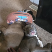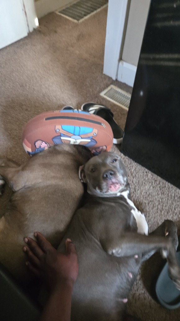 8 year old pit mix. Friendly. Female dog. She’s chipped.