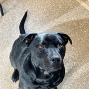 Friendly, black female pit mix with brindle coloring on belly. Knows “sit” and “shake.” Some scarring on face. Not microchipped. Proof of ownership required.