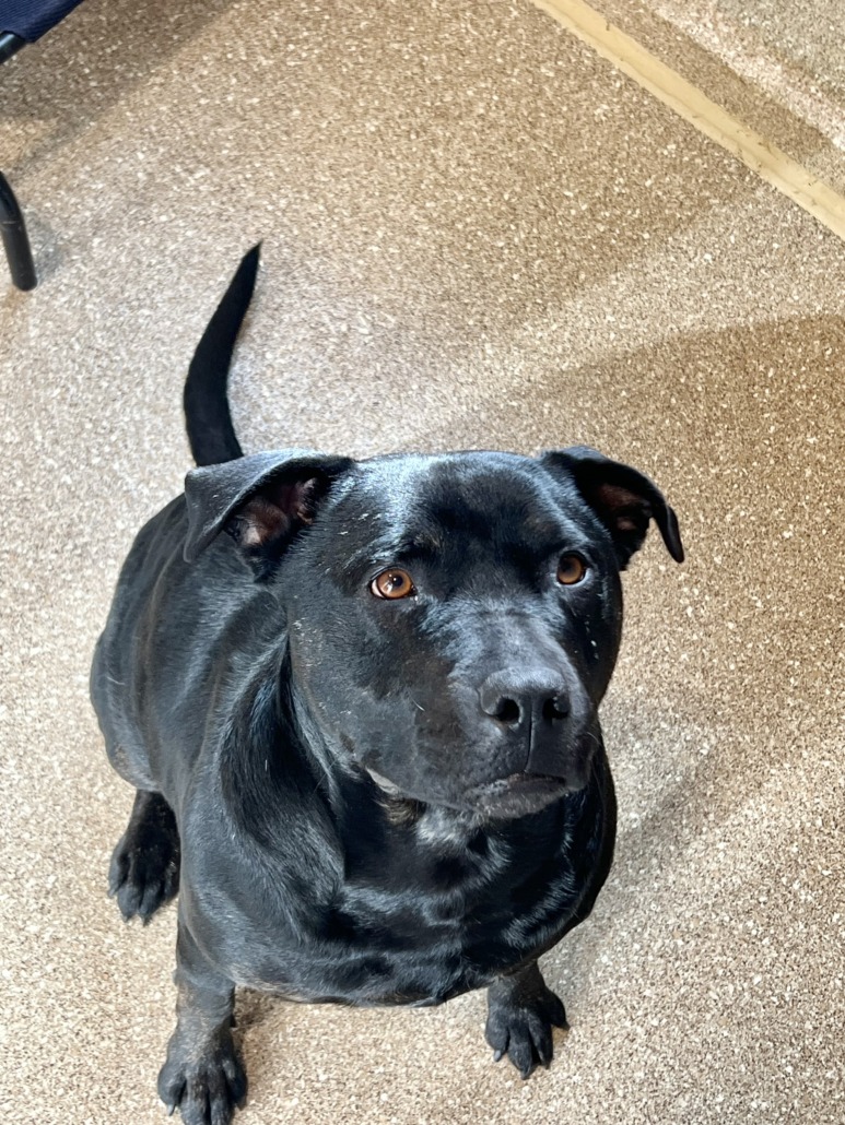Friendly, black female pit mix with brindle coloring on belly. Knows “sit” and “shake.” Some scarring on face. Not microchipped. Proof of ownership required.