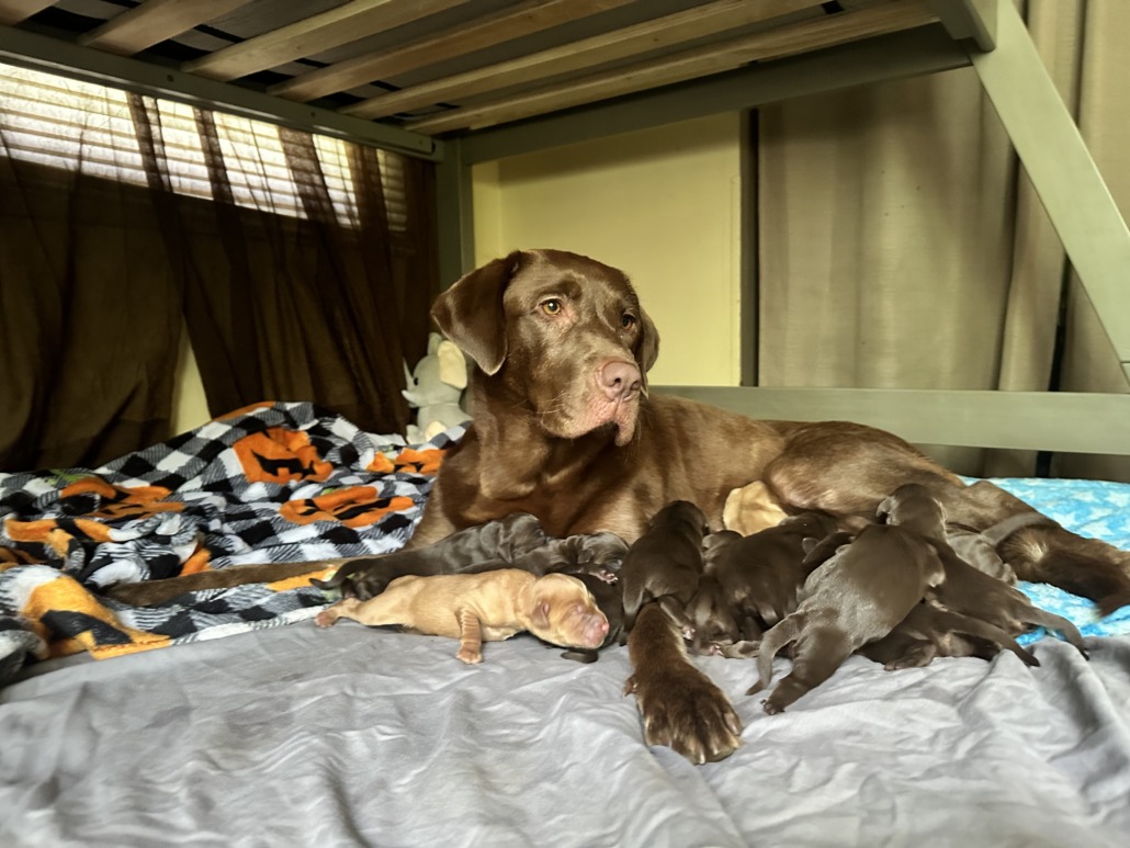 Full blood chocolate lab. Had puppies June of 2024. Lives with three small boys. Great family dog. Dearly missed.