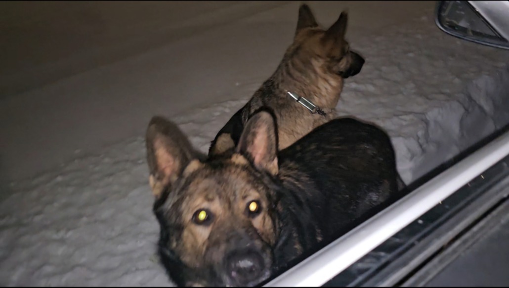 2 German shepherds with collars near Brookside Park near the pool