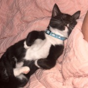 Black/white cat small less than year old really friendly ro people. Has white paws and white tummy with red bell collar