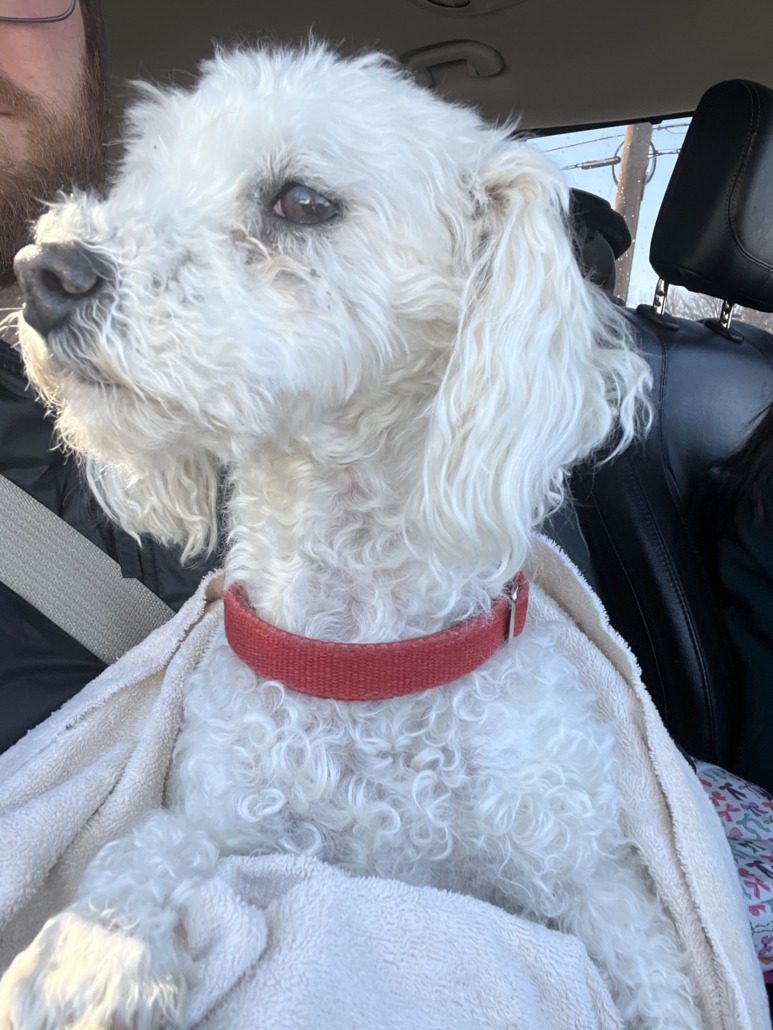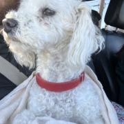 White curly haired possibly poodle mix found in Southport and Madison roaming. Red collar with no tag. Hair is trimmed short.