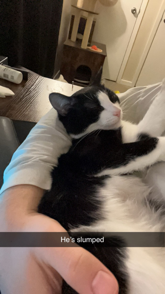 He a male tuxedo cat, with quite the belly, and is pretty good motivated, usually playful and friendly.