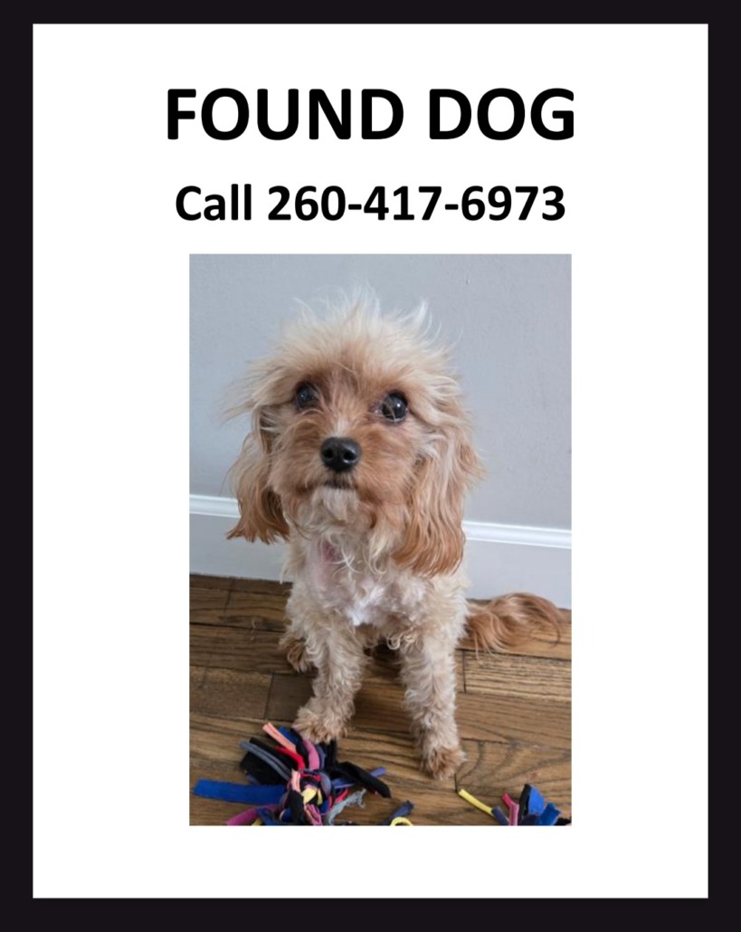 Found dog (this post is an update with better picture from my post on 1/29). Small, 7 lbs, curly fur, poodle mix. Found at cross streets S Spence Ave and Gifford Ave in Irvington (Eastside) zip code 46219. No microchip. Proof of ownership required. Please call or text 260-417-6973.
