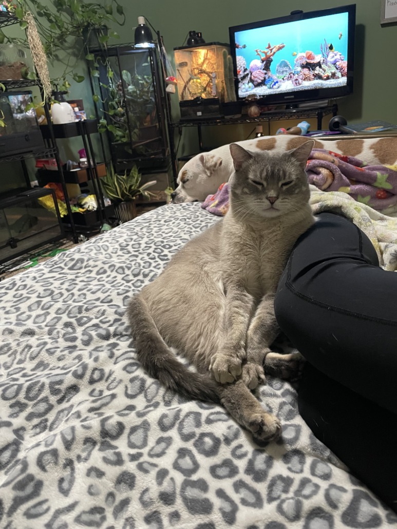 Smokey is grey with a white under coat( Siamese mix) He has bright blue eyes. he’s a thick fit boy who love scratches. He does not like being held.