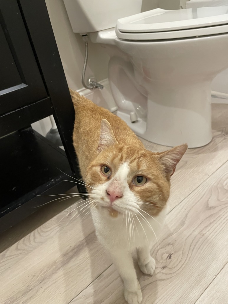 Orange and white tabby male. Has been roaming in my neighborhood for months. Has been very dirty and is not neutered but very friendly. Proof of ownership is required.