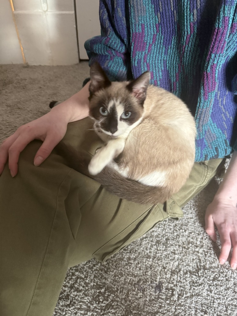 Young male kitten, bright blue eyes, looks to be part Siamese. Dark ears and tail, and dark spots on face. Very friendly and affectionate.