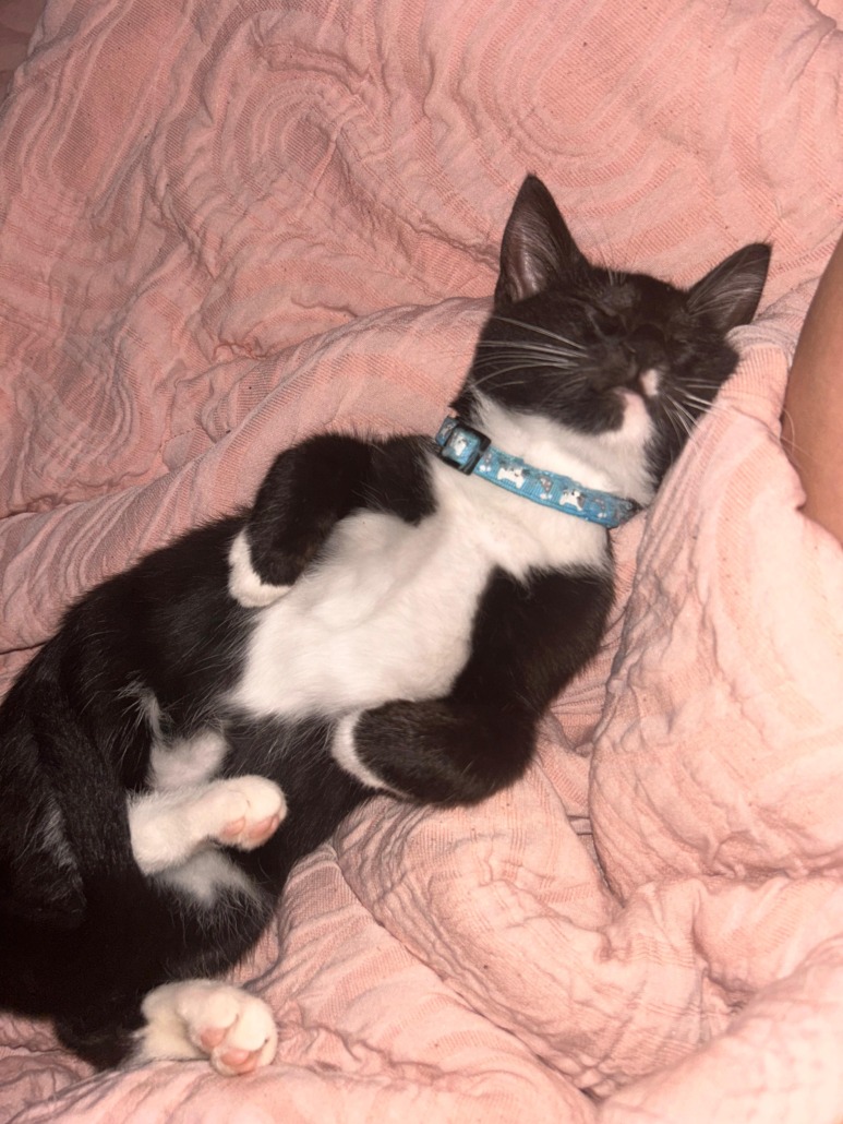 Black and white paws little white mark on the left side of mouth really friendly has red bell caller.