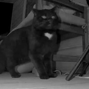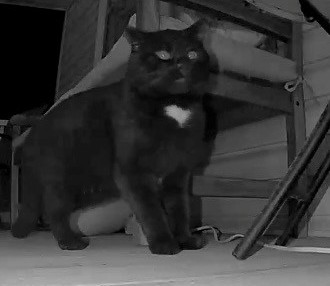Black cat with big white patch on chest. Appears to be a male, but uncertain.