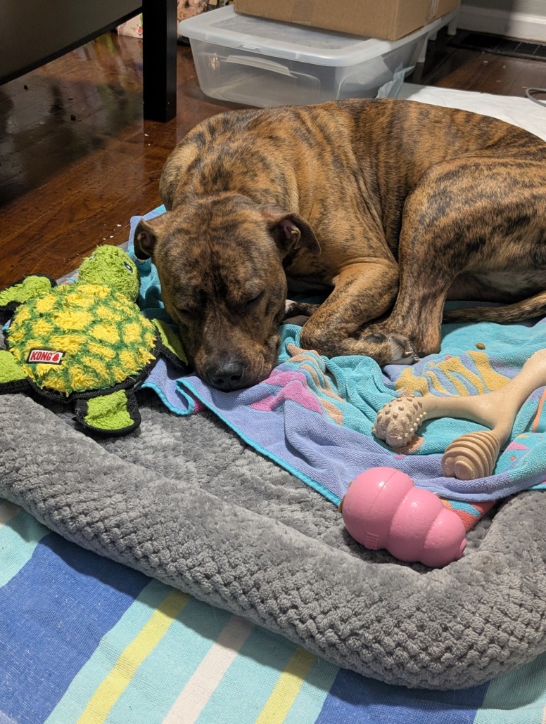 Light brindle pittie, probably about 40 lbs. May have had puppies recently. I would guess she is 1-2 years old.