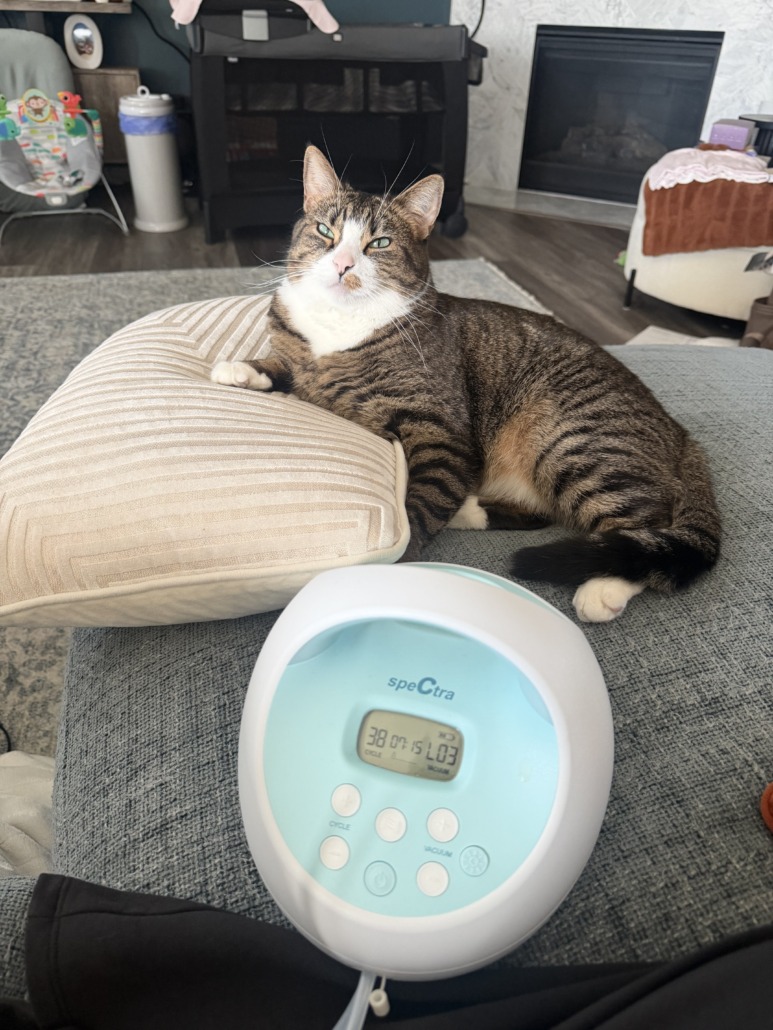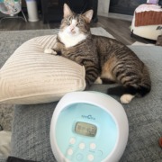 Tabby brown cat, white around nose with brown spot by mouth. White 4 paws, a very small white tip on the very very tip of her tail.