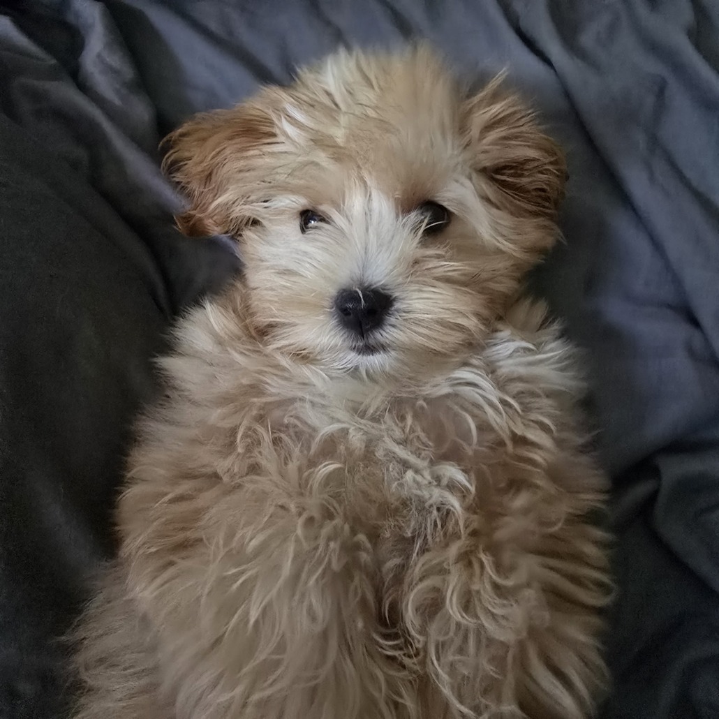 Puppy about 5 pounds, tan, with some white, Maltese mix. She had just had a bath so her collar wasnt back on.