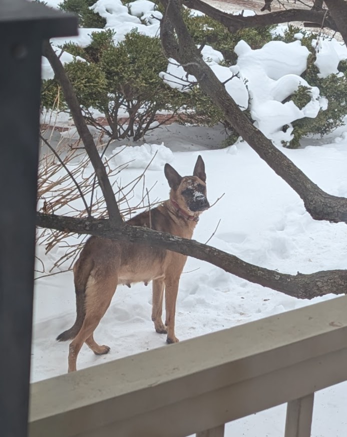 Belgian Malinois type, female, prominent nipples, striped twill collar with no noticeable identification tag. Black face/tan body. Stopped and ate at feral cat station and then took off north on Ogden checking out trash cans. Could not be approached.