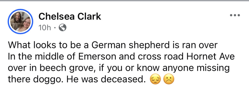 Deceased German shepherd off of Emerson and hornets dr . I came across the post of a deceased German shepherd. Sharing post here for if owner is looking