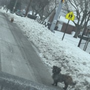 There are 2 doggies walking on w 30th st by la costeñita restaurant