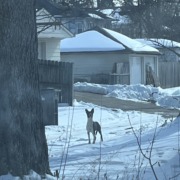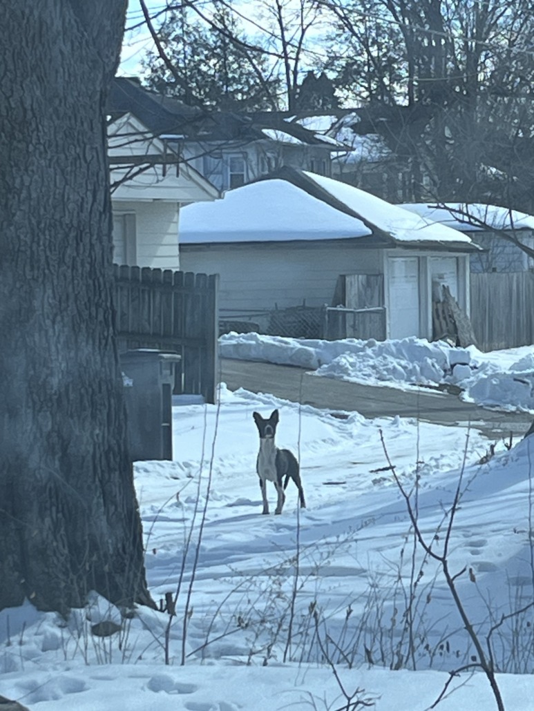 Mostly black and white dog, muscular, built like a pit bull but with pointy ears. Seen in the alleyway between Lasalle and Dearborn just south of Brookside Park. Perked up to the sound of my car, but would not approach me when I got out. No collar.