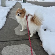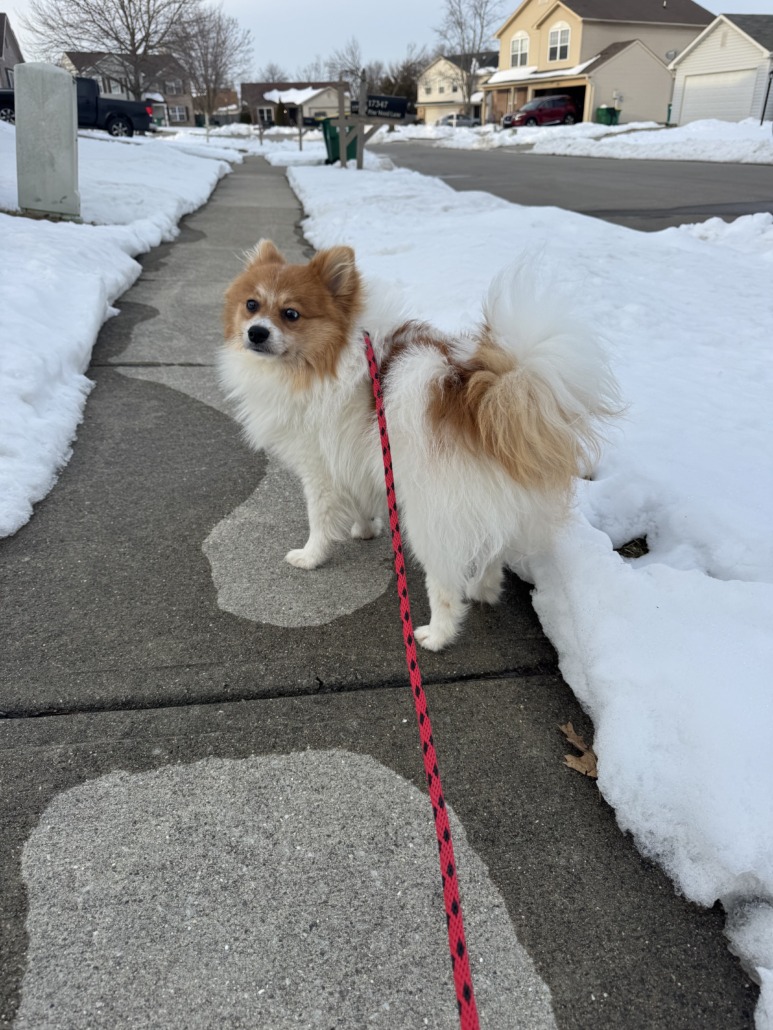 Tan and white fluffy Pomeranian with one eye that has two colors. Proof of ownership is required