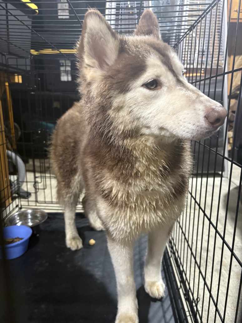 Petite female Husky with brown and white fur. She has a long marking between her eyes/down her snout with all white paws.