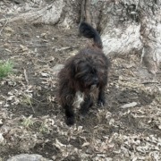 A small black dog was walking down the road it is very friendly we did not want it to get hit by a car so we picked it up.
