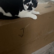 White with black spots and has orange/red/yellow eyes. He’s not wearing a collar but is microchipped. He’s extremely friendly and sweet and will most likely come to you if you have food.