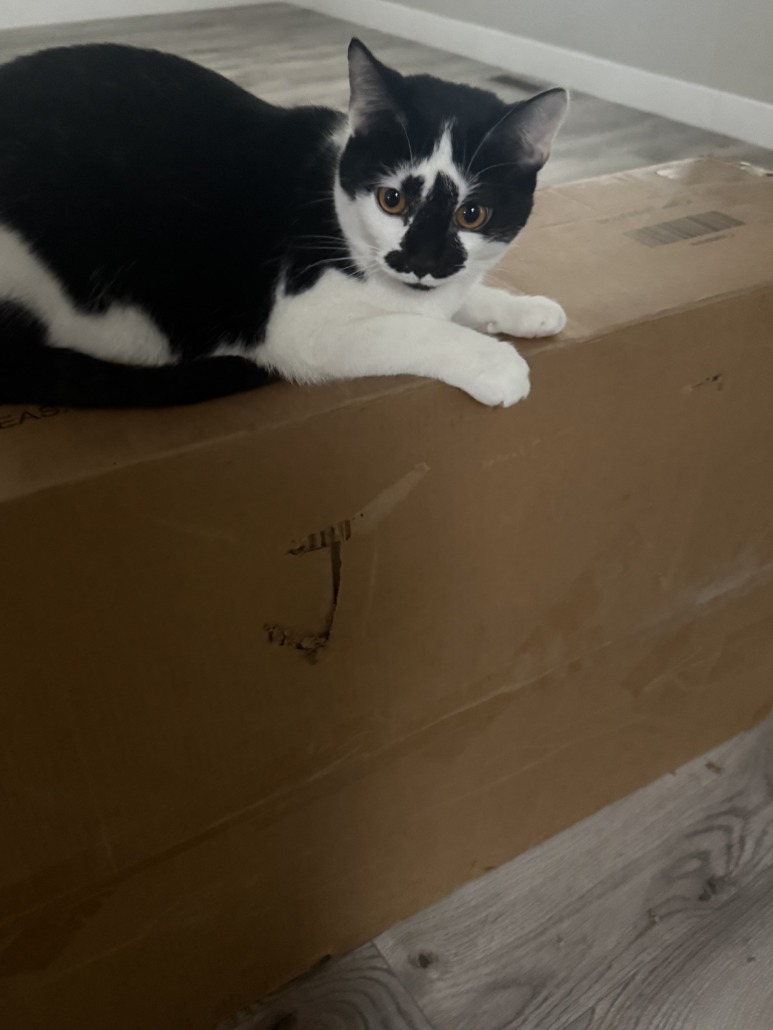 White with black spots and has orange/red/yellow eyes. He’s not wearing a collar but is microchipped. He’s extremely friendly and sweet and will most likely come to you if you have food.