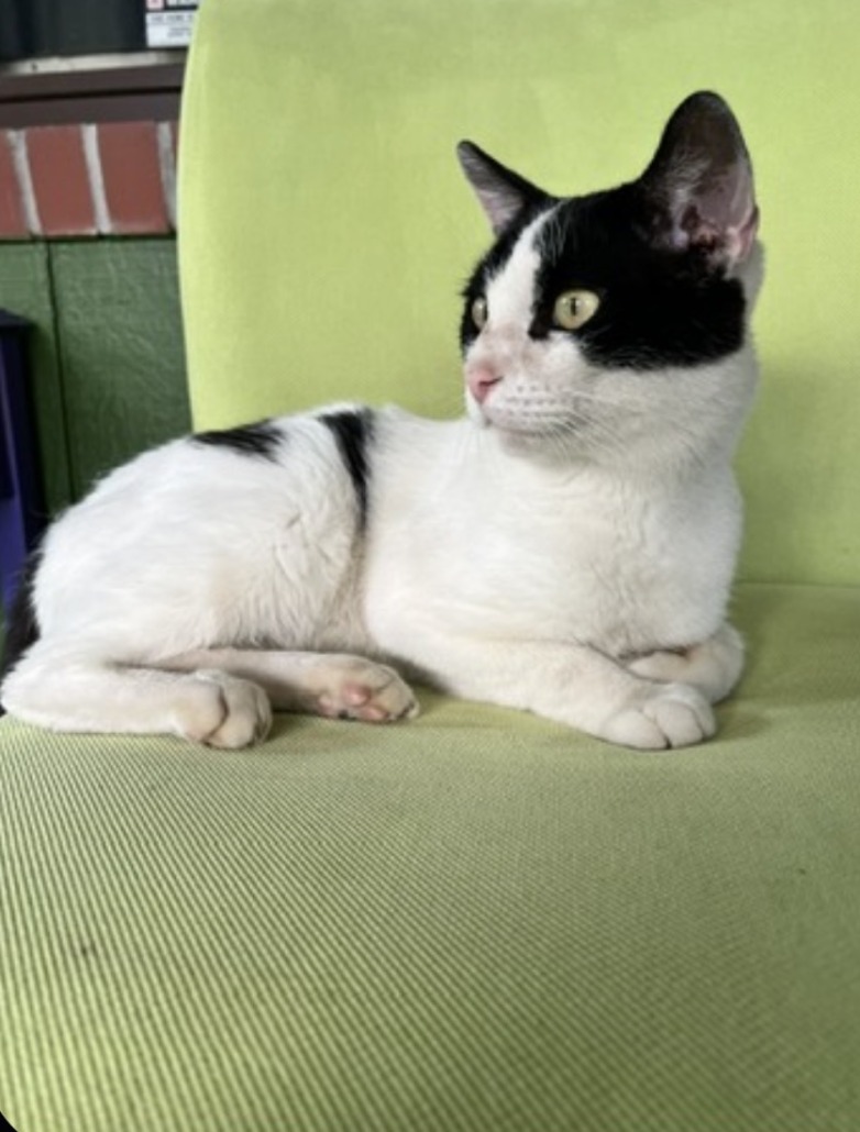 Medium size male cat. Black patches, he’s got one little patch of white on his tail. He is very food motivated, but may be shy around new people. Was an outdoor cat, originally found as a stray, but has been getting more comfortable inside this winter.