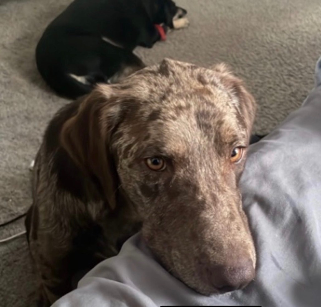 Koby is a Merle brown with a turquoise blue collar on.