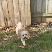Small fluffy dog. Put in my backyard to keep him safe. No collar. Will check microchip after work.
