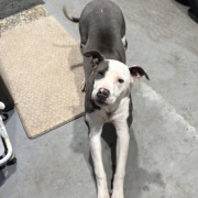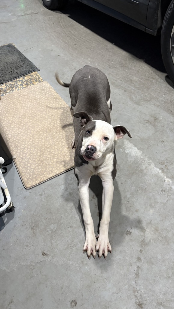 Friendly young female pit mix. Gray and white. Found her in my garage, live on e 17th street by Warren central high school