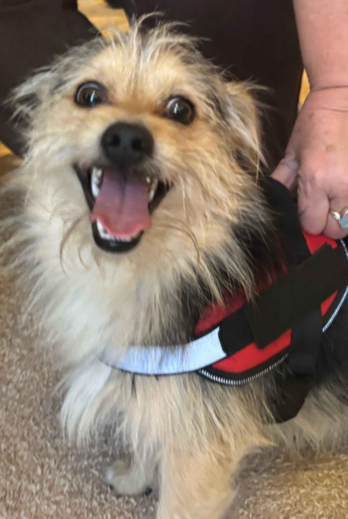 Small yorkie-esq dog with partially folded ears and wirey fur. Mostly tan with black on back and below ears. Likely around a year old based on condition of teeth. Proof required.