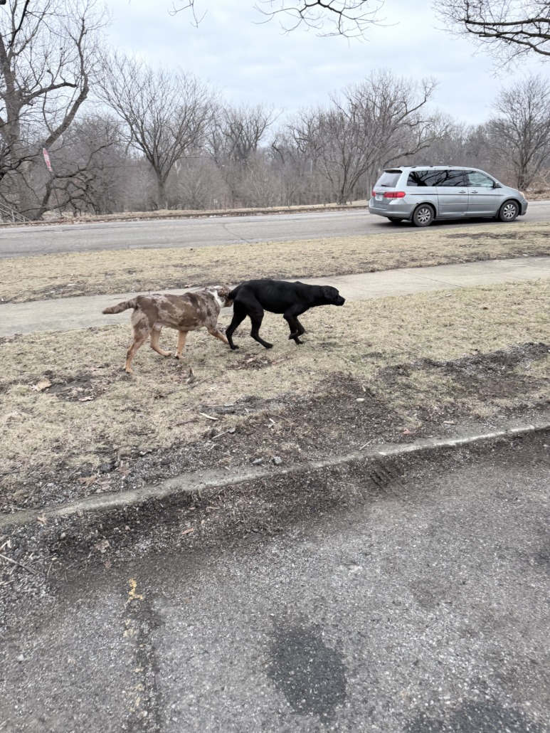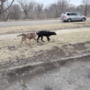 Two dogs running together near Brookside Park, male and female, male was barking, guarding the female, but very friendly. They jumped into one of the parents vehicles. They clearly love both children and people and wanted attention.