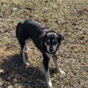 Lit hairy dog med size black with tan on legs.