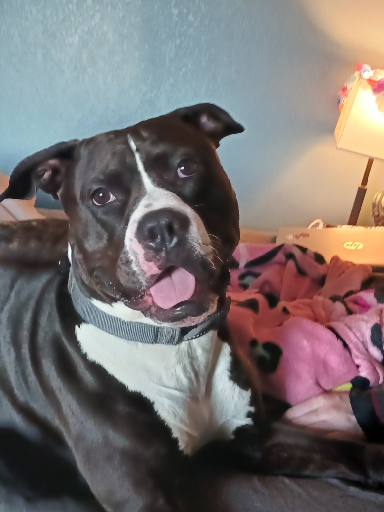 Loki is a mostly black pitbull with white on his nose, chest and the tip of his tail. He’s wearing a black and grey camo collar and is and intact male He is very friendly and will answer to Loki or Big Dawg.