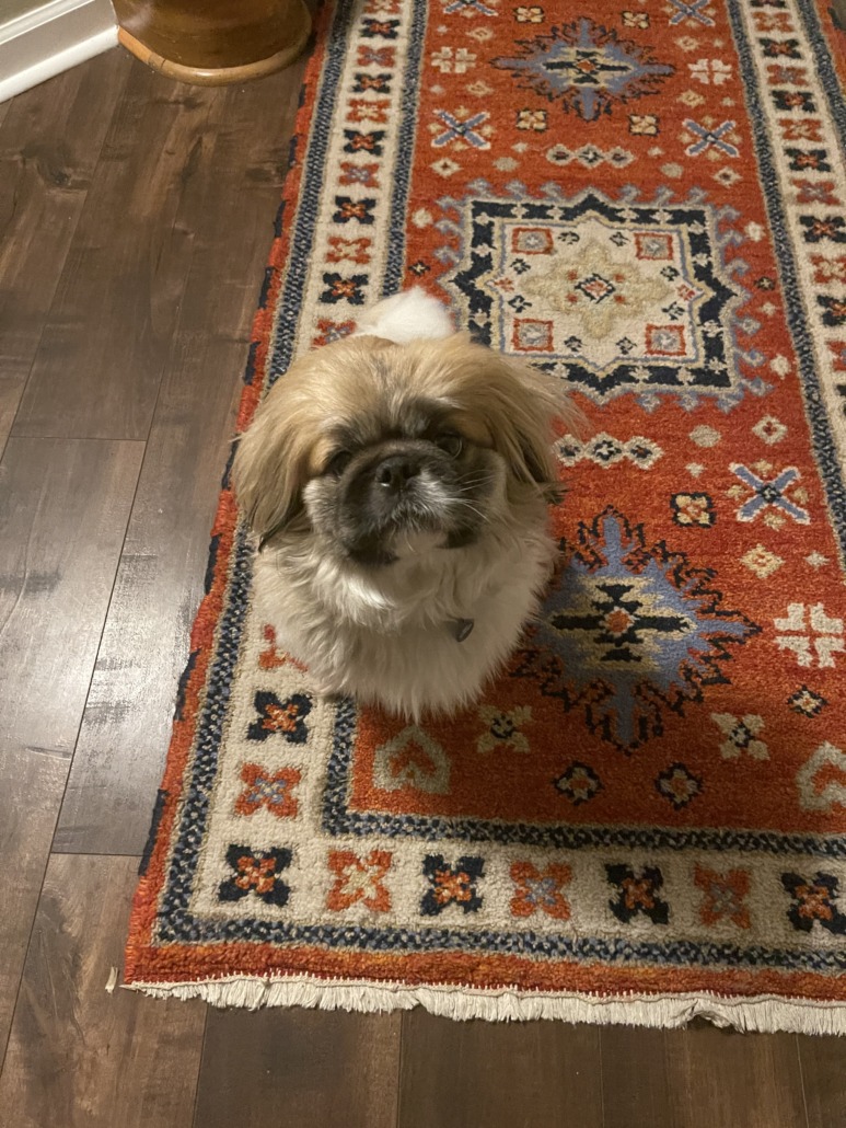 Tan and white with black muzzle. 20 pounds. Male. Pekingese. His tag fell off but he has on a collar.