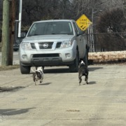 two pitbulls running down emerson ave. Saw them at emerson and english ave about 2:00pm. They are traveling together on emerson ave. Wouldnt come to me. They where black and white both of them