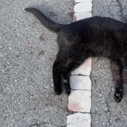 There are TWO deceased cats on the side of the road. One is all black the other is gray with some white.