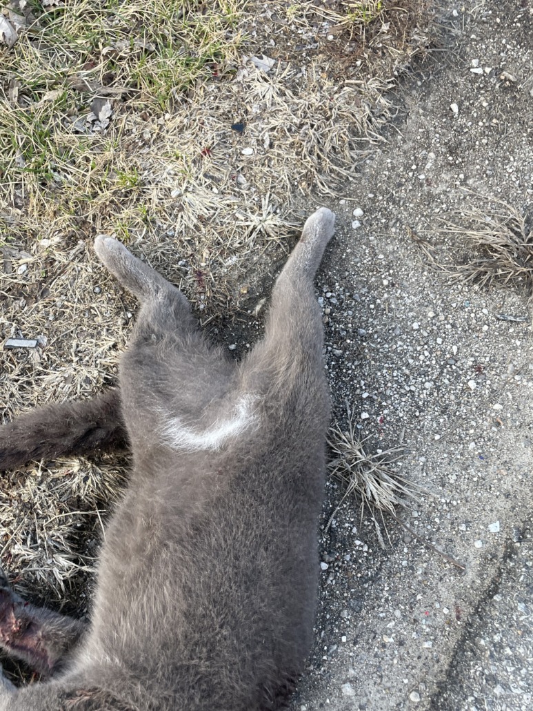 TWO deceased cats on the side of the road. One is gray and a little bit of white other is completely black.