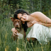 This is ivy she is a brown pit/lab mix. She is small about 30-35 lbs. She is possibly running around with a white husky mix his name is kylo they are both very sweet. Kylo has one blue eye.