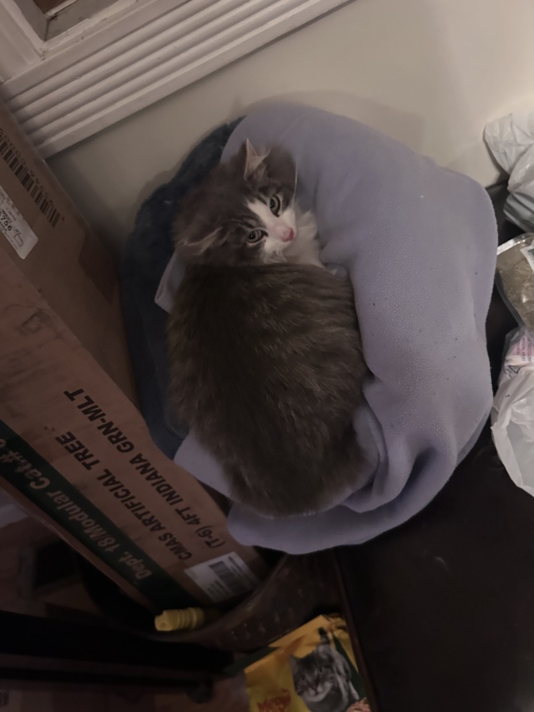 Grey and white cat maybe 6-7 months old proof of ownership required found near us 36 and Girlschool road by chaple glenn